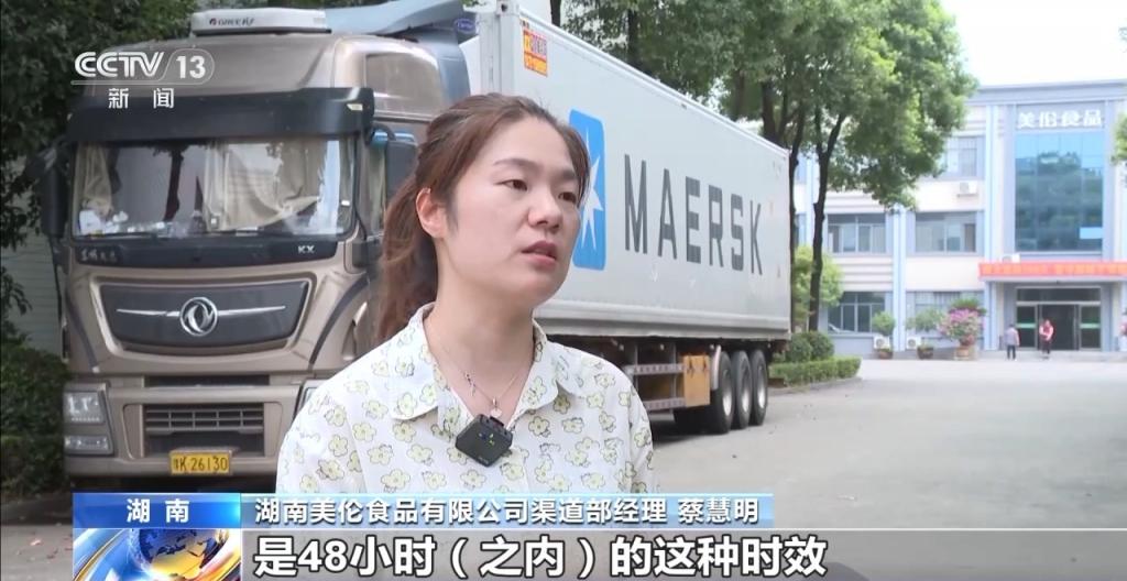 湖南美伦食品有限公司渠道部经理 蔡慧明:基本上是24小时之内,车辆到我们的工厂,然后从工厂到达港口是48小时(之内)的这种时效。全程冷链才能保证我们的产品形状的完整。